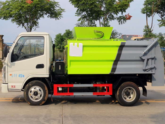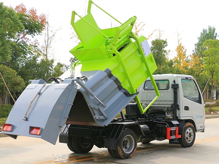 罐體采用4mm優(yōu)質(zhì)鋼材制作,方形罐體,罐體容積3~3.5方,罐體與后蓋上部采用鉸鏈連接,后蓋可利用液壓油缸打開卸料;罐體右側(cè)前部裝有掛桶提升機(jī)構(gòu)裝卸桶裝垃圾,罐體底部安裝液壓油缸實(shí)現(xiàn)罐體舉升自卸。后蓋采用液壓開啟、鎖緊。操作方式為室外手動液壓操作。