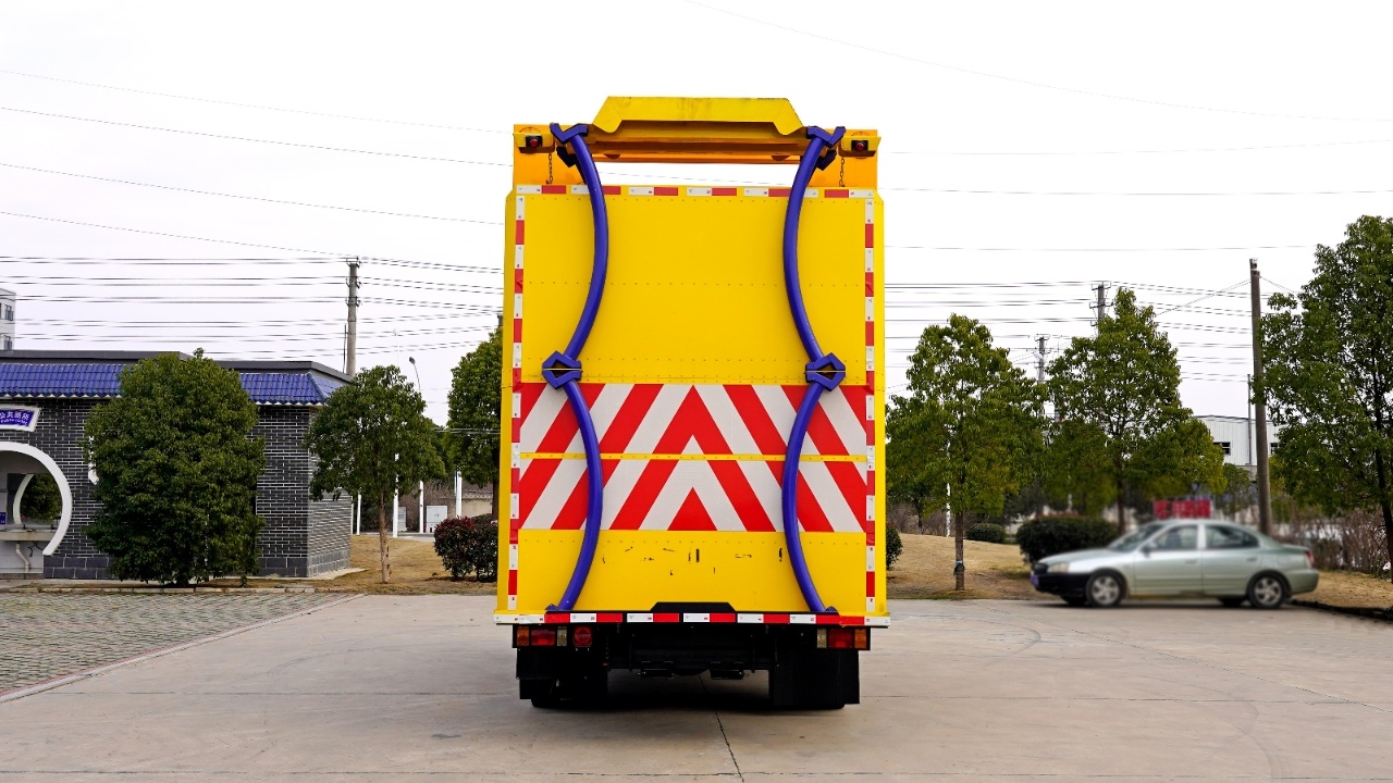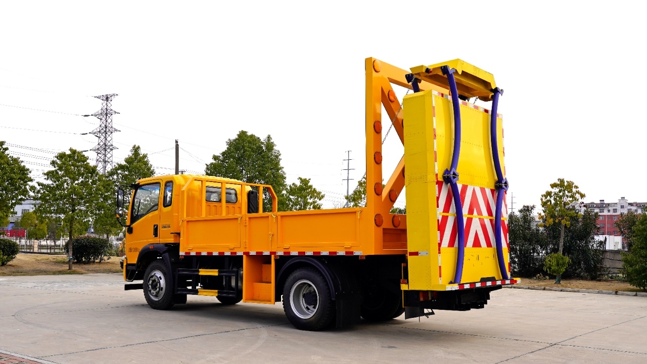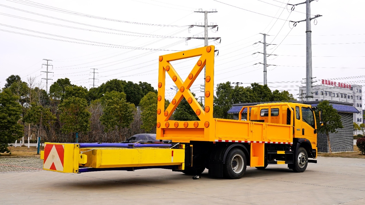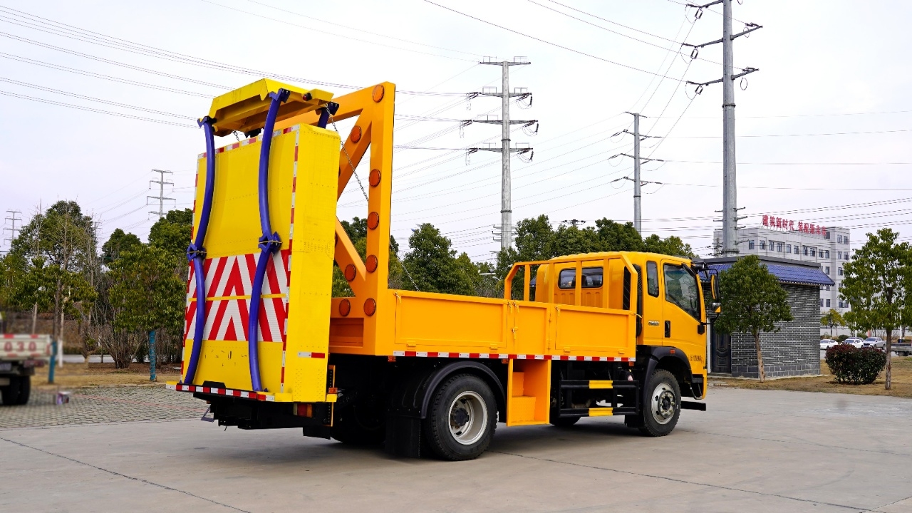 貨箱采用Q235國標(biāo)優(yōu)質(zhì)碳鋼板,箱體后部防撞緩沖模塊包采用國際知名技術(shù)產(chǎn)品100K防撞緩沖模塊,防撞緩沖吸能模塊主要由車載防撞緩沖墊和導(dǎo)向標(biāo)志架組成,充當(dāng)施工作業(yè)車輛后方的緩沖衛(wèi)士。 如若發(fā)生追尾事故,能夠在肇事車輛和前方施工作業(yè)區(qū)域之間構(gòu)建一個(gè)緩沖區(qū)域,通過機(jī)具結(jié)構(gòu)變形吸收撞擊的能量,最大限度地降低被保護(hù)人員及設(shè)備遭到碰撞的幾率。高性能液壓系統(tǒng),可實(shí)現(xiàn)快速舉升和落下操作。