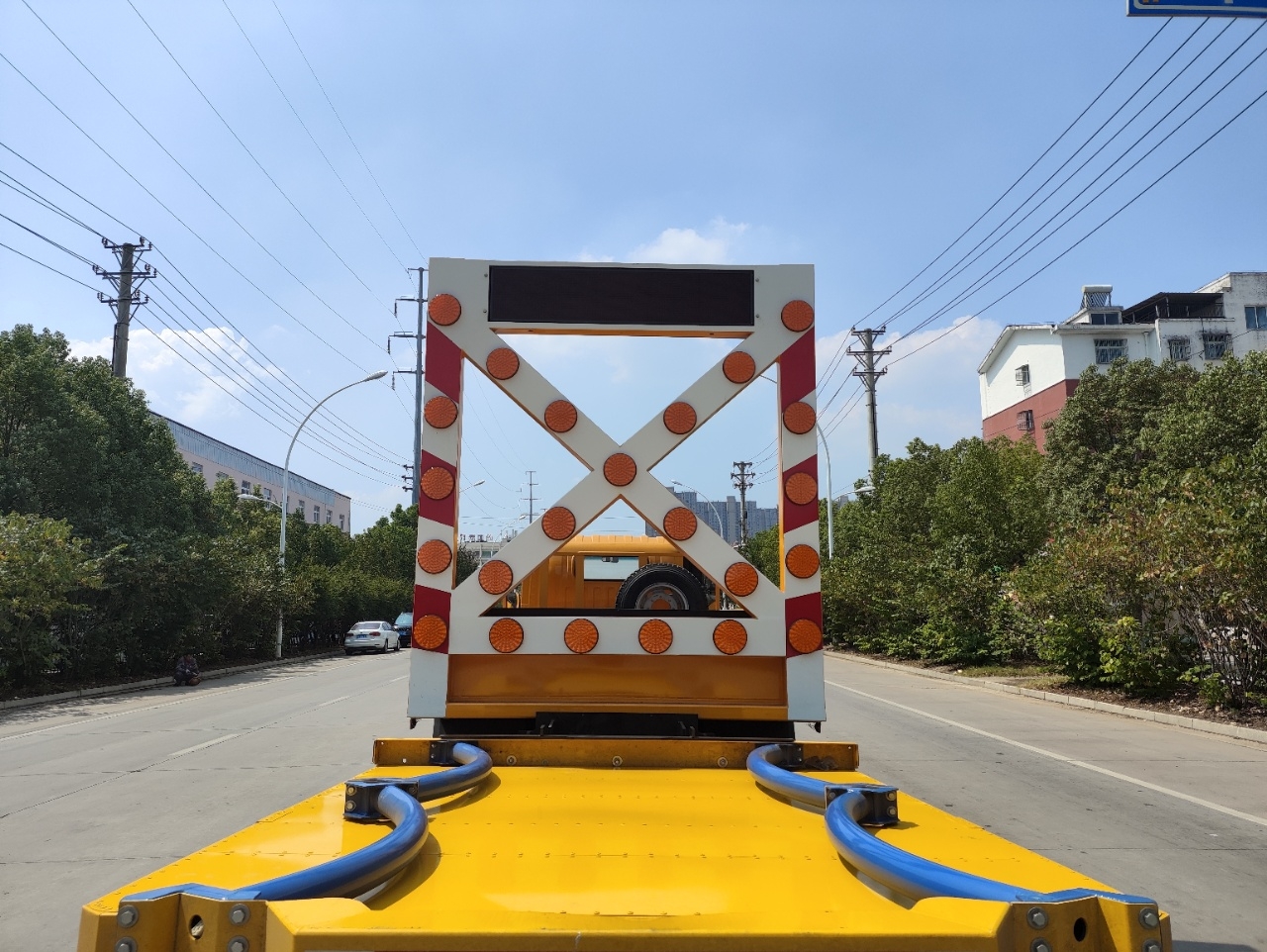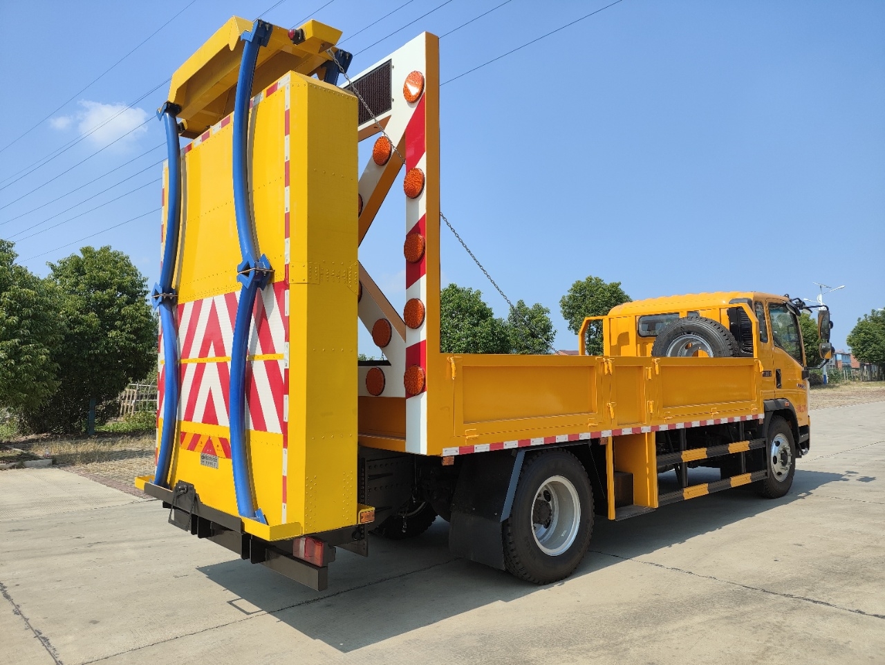 上裝配置:箱采用Q235國(guó)標(biāo)優(yōu)質(zhì)碳鋼板,箱體后部防撞緩沖模塊包采用國(guó)際知名技術(shù)產(chǎn)品100K防撞緩沖模塊,防撞緩沖吸能模塊主要由車載防撞緩沖墊和導(dǎo)向標(biāo)志架組成,充當(dāng)施工作業(yè)車輛后方的緩沖衛(wèi)士。 如若發(fā)生追尾事故,能夠在肇事車輛和前方施工作業(yè)區(qū)域之間構(gòu)建一個(gè)緩沖區(qū)域,通過(guò)機(jī)具結(jié)構(gòu)變形吸收撞擊的能量,最大限度地降低被保護(hù)人員及設(shè)備遭到碰撞的幾率。高性能液壓系統(tǒng),可實(shí)現(xiàn)快速舉升和落下操作。