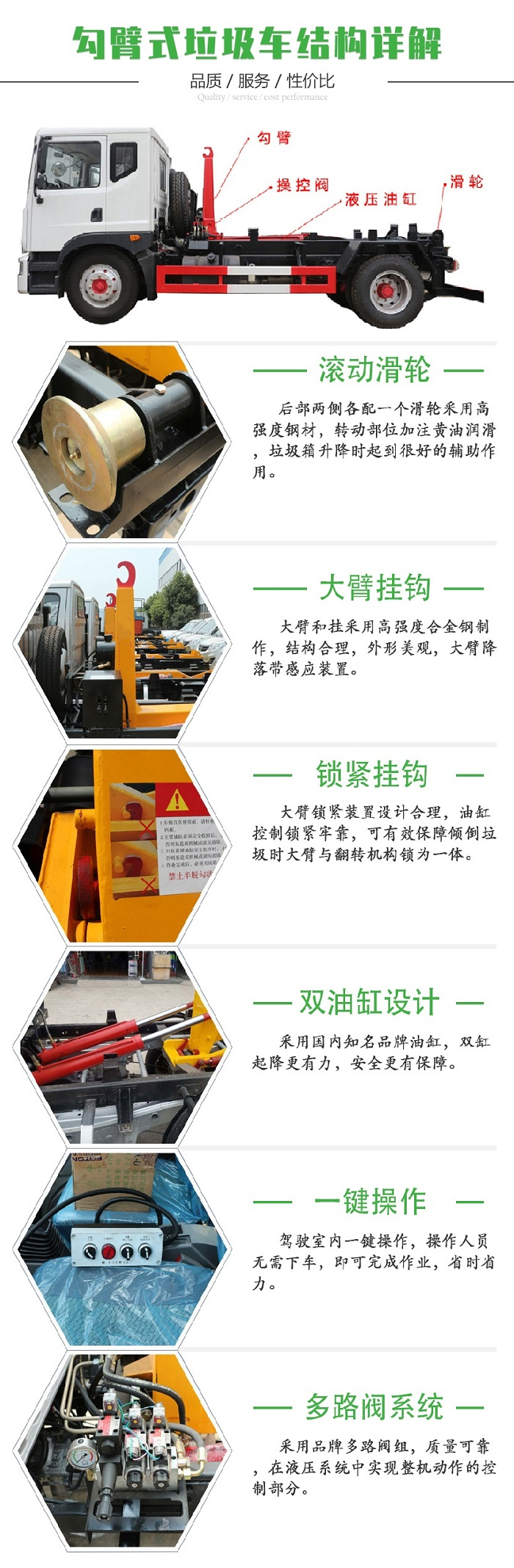 一車可配多個垃圾箱,適用于小區(qū)、街道、農(nóng)村集鎮(zhèn)等垃圾收集投放,配套2~3立方米勾臂垃圾箱,高強(qiáng)度主勾臂,雙油缸支撐,后尾部滾輪,帶鎖緊裝置,鎖緊后可實(shí)現(xiàn)自卸功能,國產(chǎn)液壓系統(tǒng),多路閥,室外操作,可選裝室內(nèi)操作。 垃圾箱尺寸:2.2米×1.45米×1米