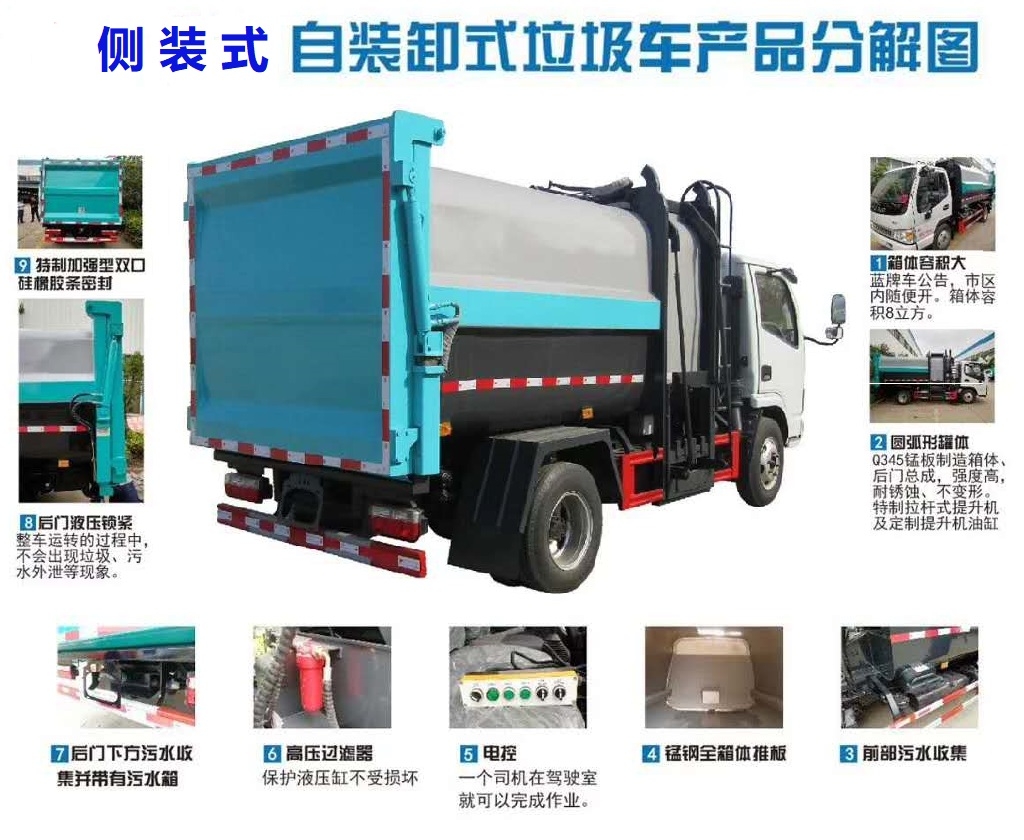 上裝配置:新款箱體,箱體為武鋼優(yōu)質(zhì)碳鋼板材料,箱體內(nèi)部做防腐防銹處理,全推式推板,垃圾壓縮站箱體尾部可對接功能,車尾部帶厚橡膠密封條帶污水收集槽,防污水滴漏,箱體側(cè)方帶掛桶架翻轉(zhuǎn)上料機(jī)構(gòu),電動手動雙操控系統(tǒng),駕駛室與車尾部雙操控器,PLC一鍵**,箱體可按要求噴繪圖案和字樣。