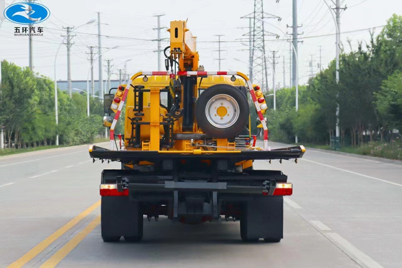 上裝配置:直板,5T上裝, 5T后托,配備一個50kn液壓絞盤(25米鋼絲繩),5MM厚花紋板,大梁全包,輔助小車兩個,四根捆綁器,輕量化擋泥板,七字叉一對(車胎抱死時使用),方形套筒一對,三角擋胎器一對,洗手壺一個,一對工作燈燈,工具箱一個,大力神配5噸4節(jié)臂吊機。工作半徑11米,舉升高度:13米.板長:5.6米,寬:2.42米