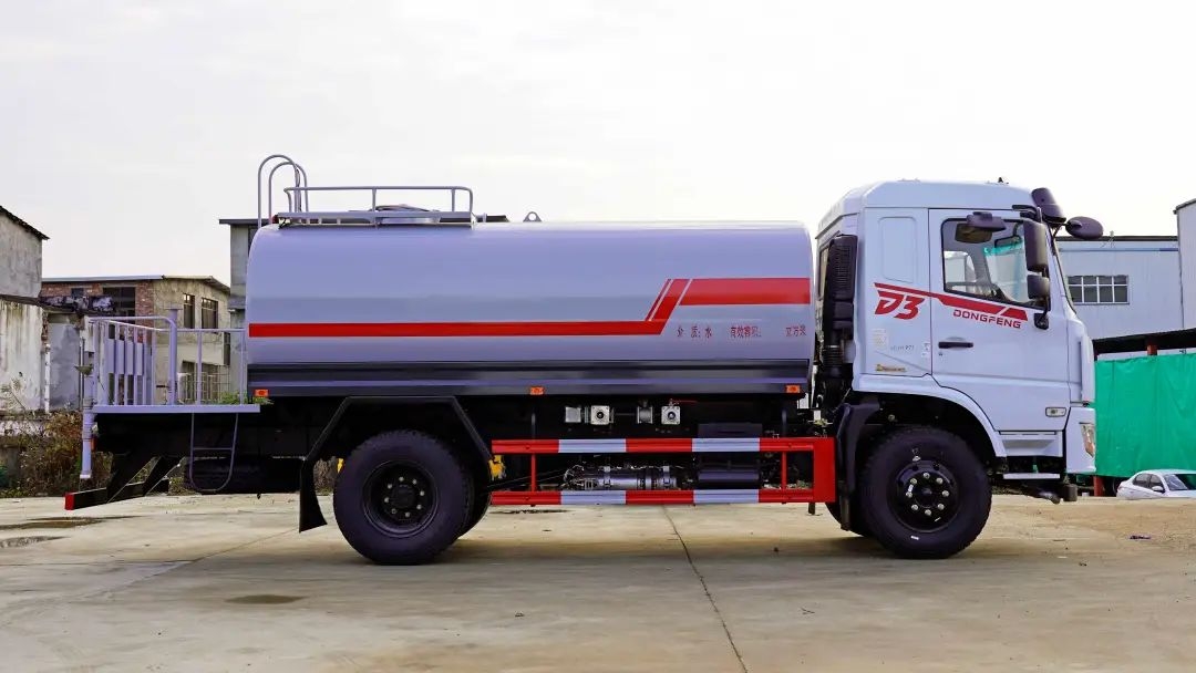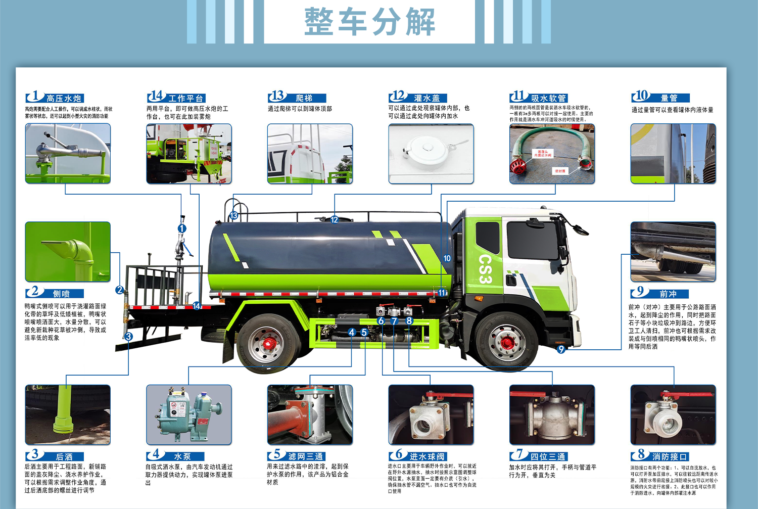 2.灑水車前沖(噴)后灑,帶側噴,罐體后帶工作臺,平臺上安裝綠化灑水炮。灑水炮可全方位旋轉(zhuǎn),可連續(xù)調(diào)成直沖狀、大雨、小雨、毛毛雨;