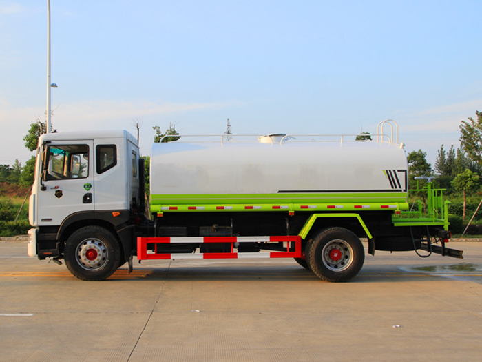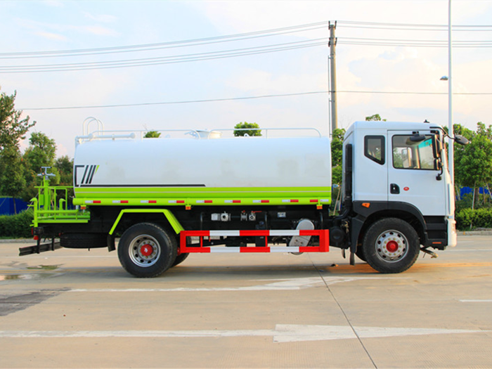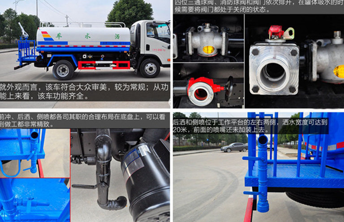 改裝配置:罐體用4MM碳鋼板制作,罐內(nèi)隔板具有防波作用,以減低汽車行駛時(shí)罐體液體的沖擊。整車帶一個(gè)專用灑水泵(垂直最大吸程6米),灑水寬度14米,射程28米。多功能灑水車配備2個(gè)前沖(噴)(能將路面泥巴、塵土、垃圾沖干凈);2個(gè)后灑(能均勻地將水灑在路面,一次灑水寬度14米)、2個(gè)側(cè)噴(花灑)(能均勻地將路旁綠化帶澆灌)、帶1個(gè)后工作平臺(tái),平臺(tái)上安裝1個(gè)綠化灑水高炮(灑水炮可全方位旋轉(zhuǎn),可連續(xù)調(diào)成直沖狀、大雨、小雨、毛毛雨,霧狀可調(diào)節(jié)沖洗高大樹(shù)木),引水時(shí)間<5min,流量90m3/h。帶1個(gè)消防接頭,帶1個(gè)自流閥,1個(gè)過(guò)濾裝置、人性化爬梯及側(cè)防護(hù)欄,安裝灑水音樂(lè)喇叭。