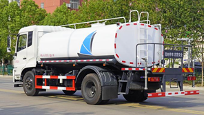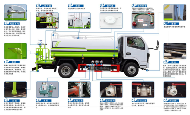 *改裝配置:罐體用4MM碳鋼板制作,罐內(nèi)隔板具有防波作用,以減低汽車行駛時罐體液體的沖擊。整車帶一個專用灑水泵(垂直最大吸程6米),灑水寬度14米,射程28米。多功能灑水車配備2個前沖(噴)(能將路面泥巴、塵土、垃圾沖干凈);2個后灑(能均勻地將水灑在路面,一次灑水寬度14米)、2個側(cè)噴(花灑)(能均勻地將路旁綠化帶澆灌)、帶1個后工作平臺,平臺上安裝1個綠化灑水高炮(灑水炮可全方位旋轉(zhuǎn),可連續(xù)調(diào)成直沖狀、大雨、小雨、毛毛雨,霧狀可調(diào)節(jié)沖洗高大樹木),引水時間<5min,流量90m3/h。帶1個消防接頭,帶1個自流閥,1個過濾裝置、人性化爬梯及側(cè)防護欄,安裝灑水音樂喇叭。
