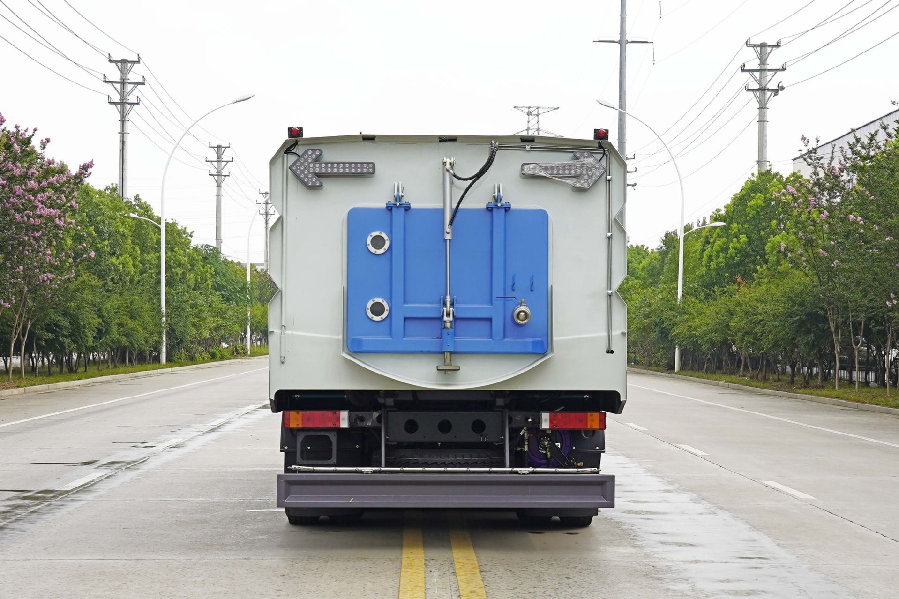 》上裝主要配置:副發(fā)動(dòng)機(jī)、風(fēng)機(jī)、高壓水泵、清水箱(9立方)、垃圾箱(7立方)、左右立掃、帶噴水桿的寬吸嘴、低壓沖洗系統(tǒng)、掃盤降塵系統(tǒng)、液壓系統(tǒng)、專用裝置電控系統(tǒng)和副車架等改裝而成,副發(fā)動(dòng)機(jī)采用康明斯170馬力副發(fā)動(dòng)機(jī),帶2個(gè)中置掃盤,力頓馬達(dá),GTM高壓水泵,高壓路沿清洗噴頭,低壓泵(前沖),不銹鋼垃圾箱,不銹鋼管高壓管路,CAN總線控制,尾部LED箭頭燈,15米高壓洗車卷揚(yáng),垃圾箱、水箱帶防溢低水位報(bào)警裝置,倒車及洗掃狀態(tài)室內(nèi)監(jiān)視器!