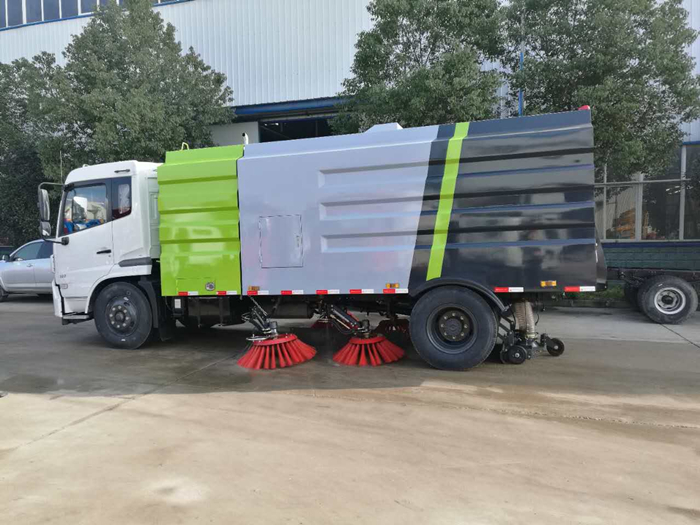 該掃路車采用東風(fēng)天錦二類底盤改裝,加裝副發(fā)動機、風(fēng)機、清水箱、垃圾箱、左右立掃、掃盤降塵系統(tǒng),液壓系統(tǒng)、專用裝置電控系統(tǒng)和副車架等改裝而成。