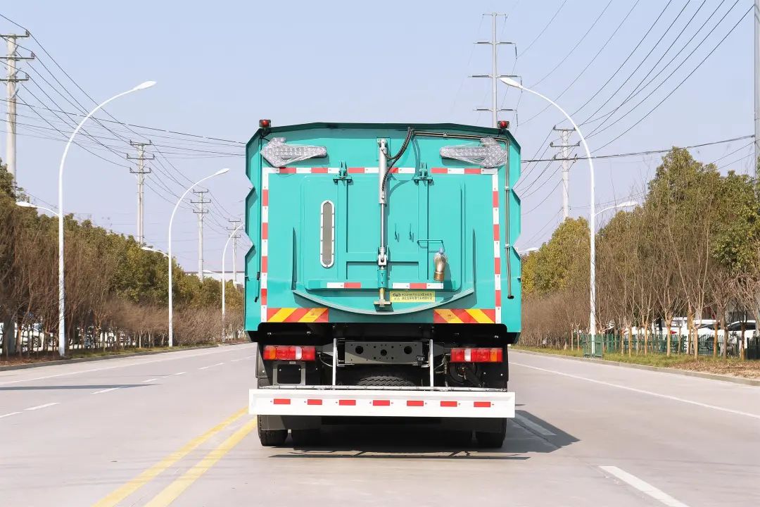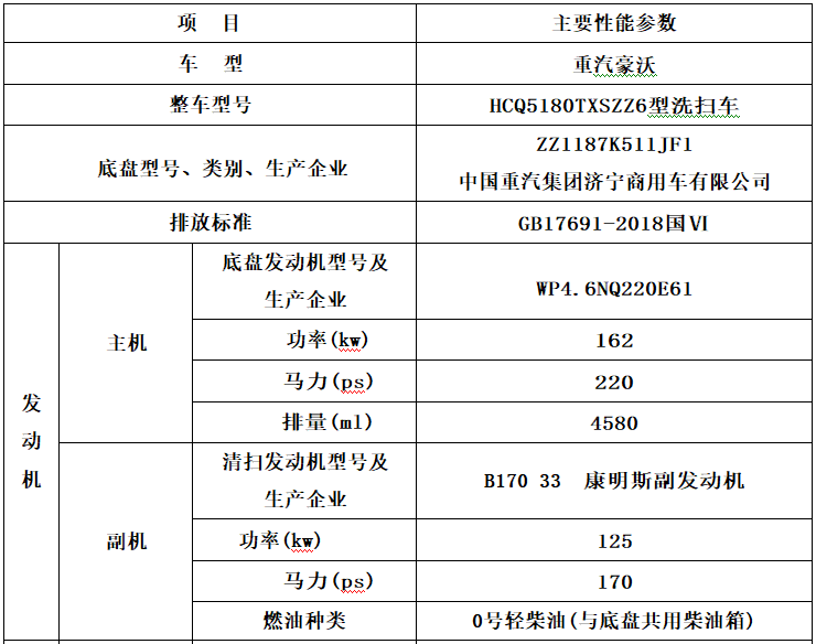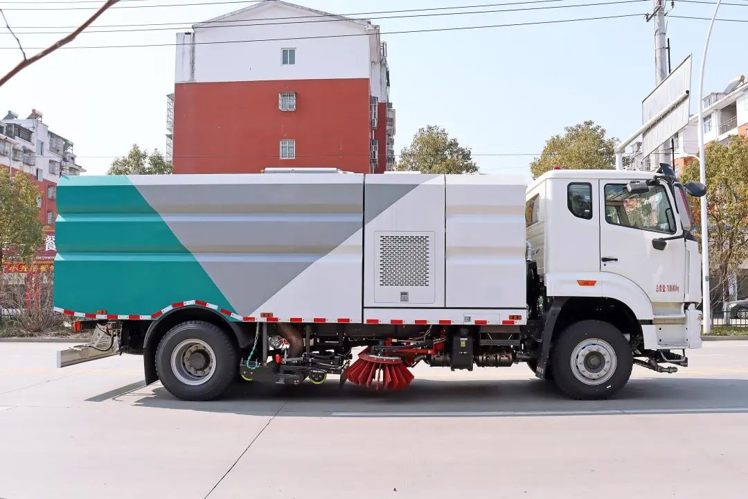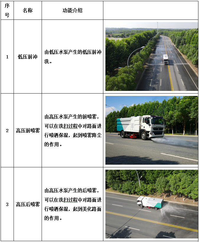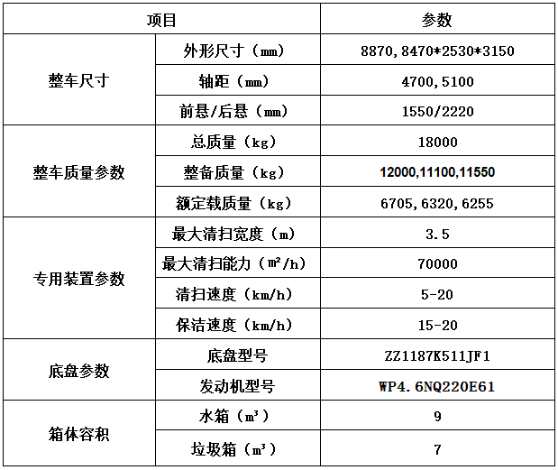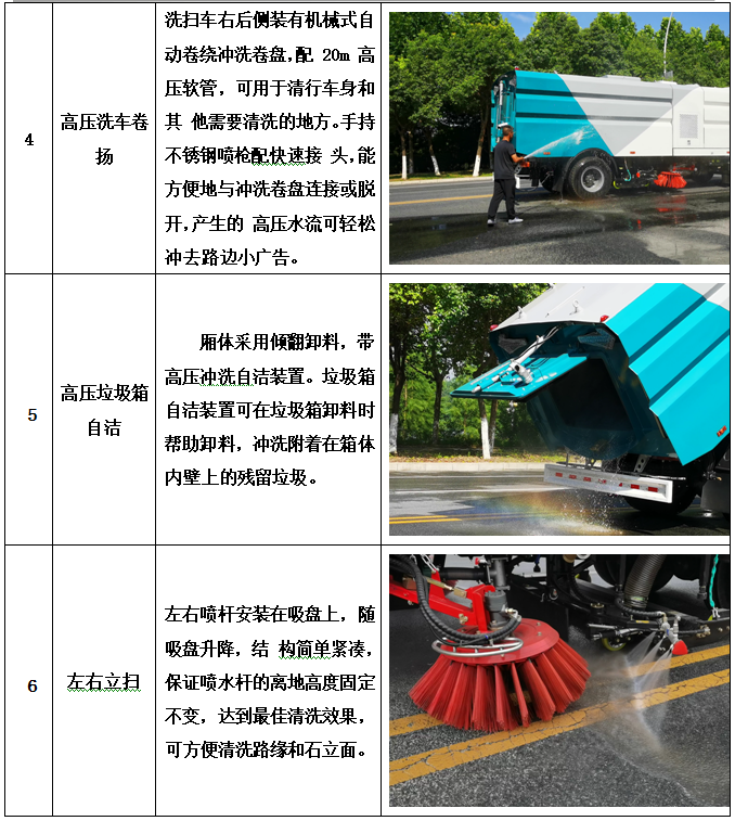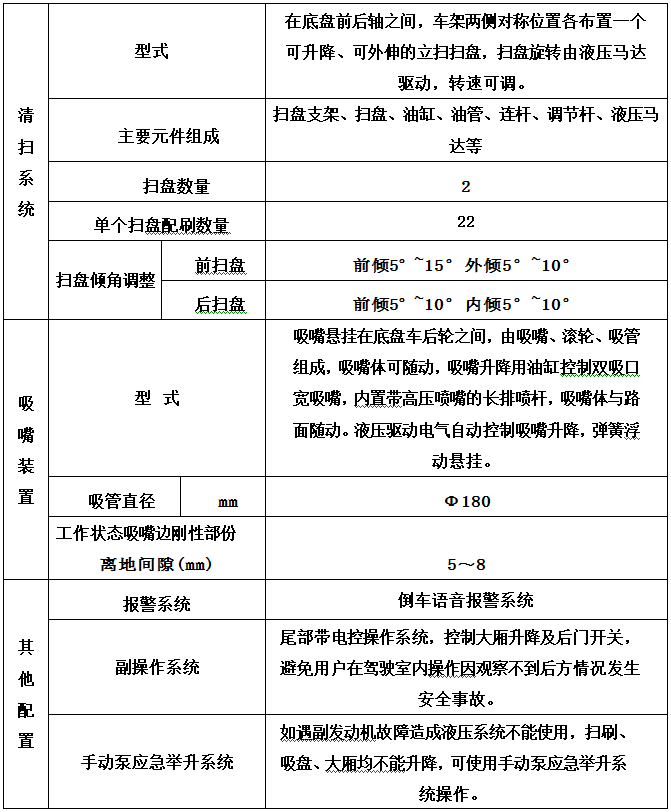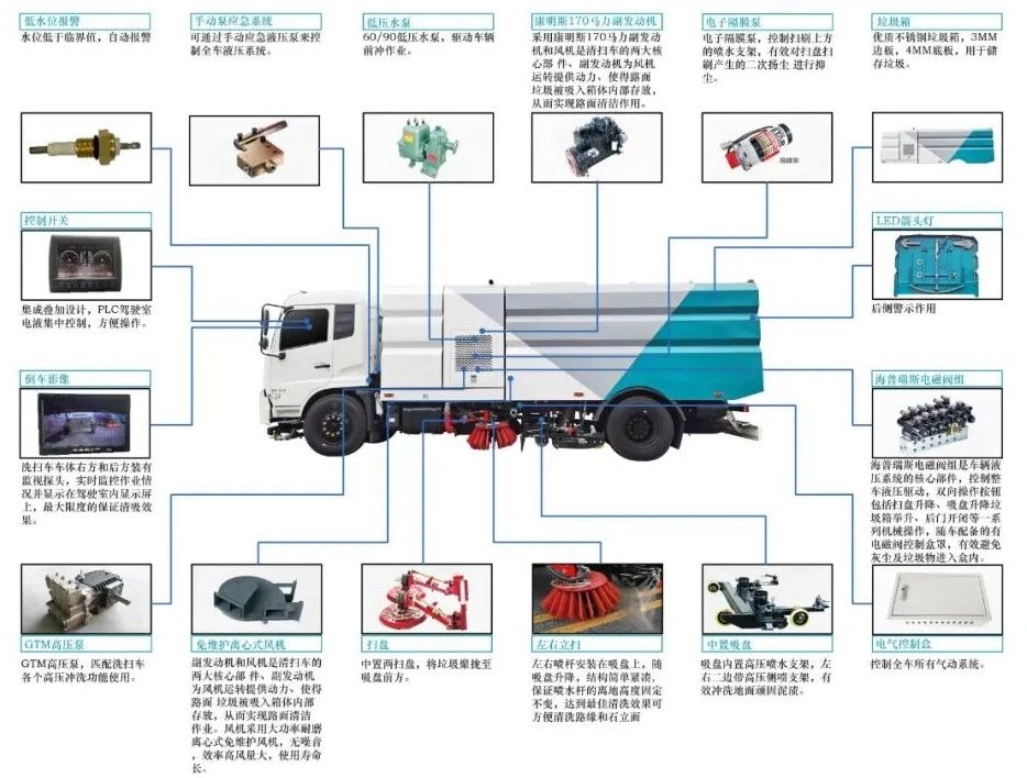 加裝副發(fā)動機、風機、高壓水泵、清水箱、垃圾箱、左右立掃、帶噴水桿的寬吸嘴、低壓沖洗系統(tǒng)、掃盤降塵系統(tǒng)、液壓系統(tǒng)、專用裝置電控系統(tǒng)和副車架等改裝而成,副發(fā)動機采用康明斯170馬力副發(fā)動機,帶2個中置掃盤,力沃馬達,低壓水泵,GTM高壓水泵(前沖側(cè)噴中噴后噴霧沖洗水槍垃圾箱自潔裝置);高壓路沿清洗噴頭;不銹鋼垃圾箱;不銹鋼管高壓管路;PLC一鍵控制;尾部LED箭頭燈;垃圾箱、水箱均帶防溢低水位報警裝置;倒車及洗掃狀態(tài)室內(nèi)監(jiān)視器。20米沖洗卷盤。水箱9方,垃圾箱7立方。
