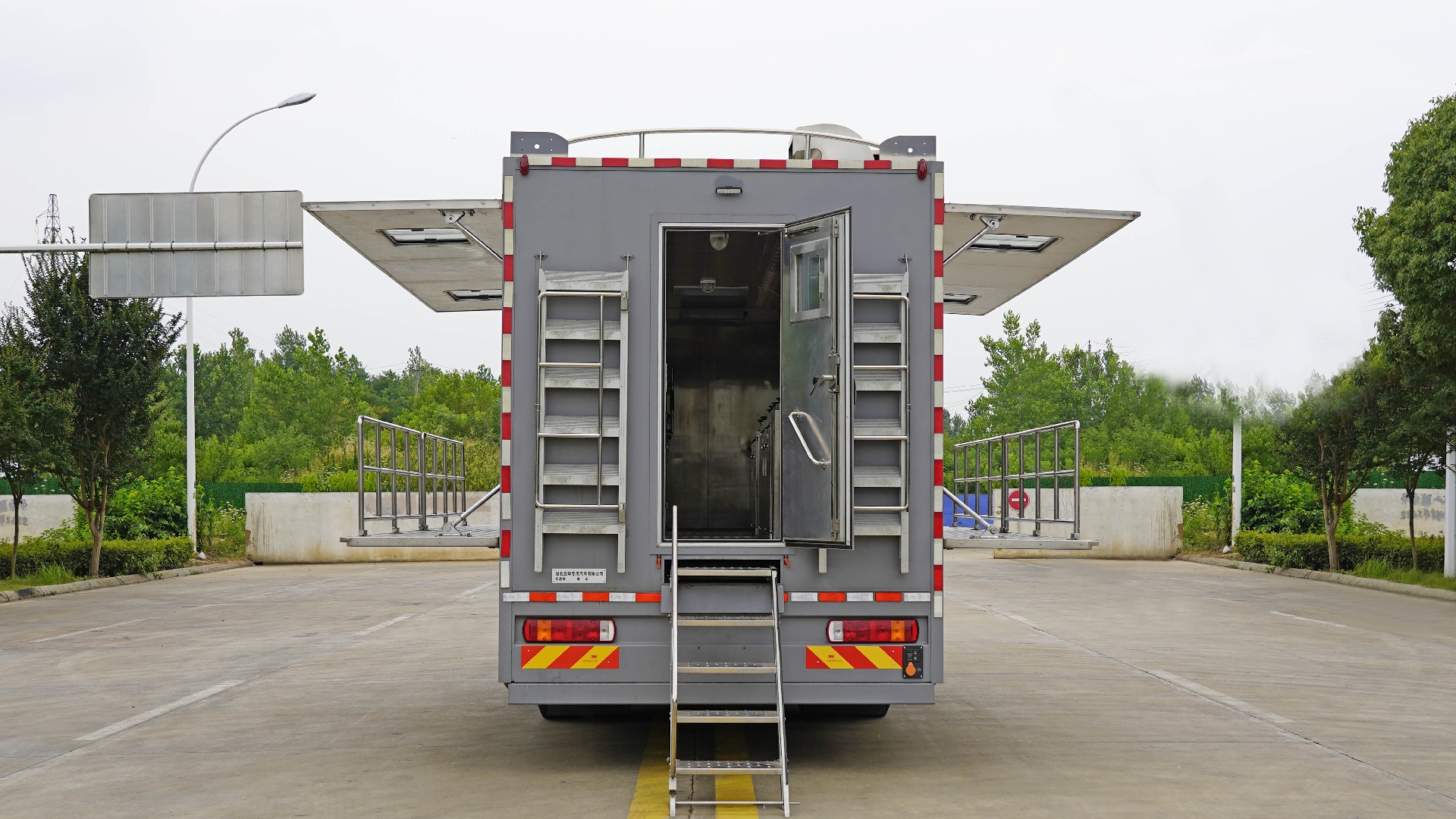 該車主要用于野外炊事餐飲保障,專用裝置:集成灶臺、蒸飯柜、車廂等.廂體頂部封閉,不可開啟,后部安裝作業(yè)照明燈,該燈用于作業(yè)時照明,只能在車輛切換為作業(yè)狀態(tài)時使用,行駛狀態(tài)不能點亮,該車在駐車狀態(tài)下,側面可開啟.隨底盤選裝限速裝置,最高車速(km/h)為80,89.后懸架僅采用鋼板彈簧懸架.側防護采用裙板結構,后防護材料為Q235B,連接方式為螺栓連接,截面尺寸為(mm)120×60,后防護離地高度:400mm,ABS系統(tǒng)控制器生產(chǎn)企業(yè)/型號為威伯科(上海)管理有限公司/4460046300,廣州瑞立科密汽車電子股份有限公司/CM4XL-4S/4M;選裝EBS,EBS系統(tǒng)控制器生產(chǎn)企業(yè)/型號為威伯科(上海)管理有限公司/EBS3.整車長/軸距/后懸對應關系(mm):9980(10050/10150)/5600/2950(3020/3120),10180(10250/10350)/5800/2950(3020/3120).該車采用軸距:5600mm,5800mm. |